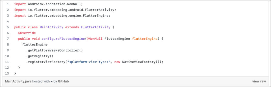 Register the platform view by modifying the App’s MainActivity.java file under example/android/app/src/main/…/MainActivity.java with the below changes.