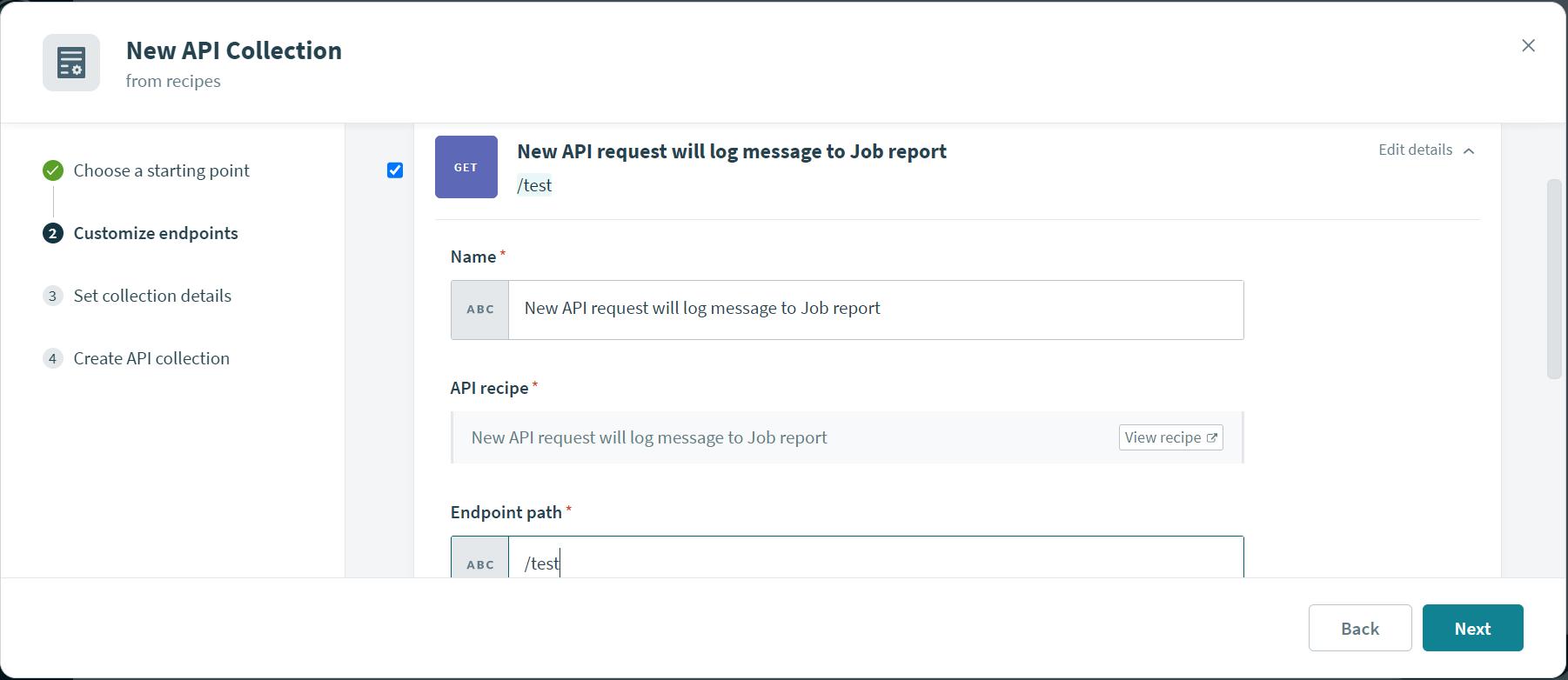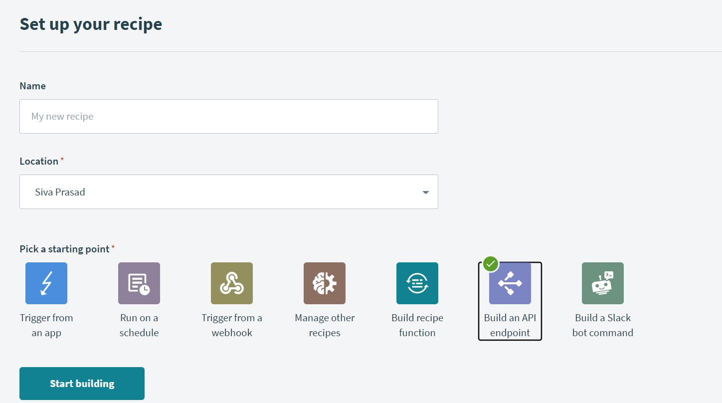 Create a recipe by selecting the BUILD AN API ENDPOINT trigger for getting the URL.