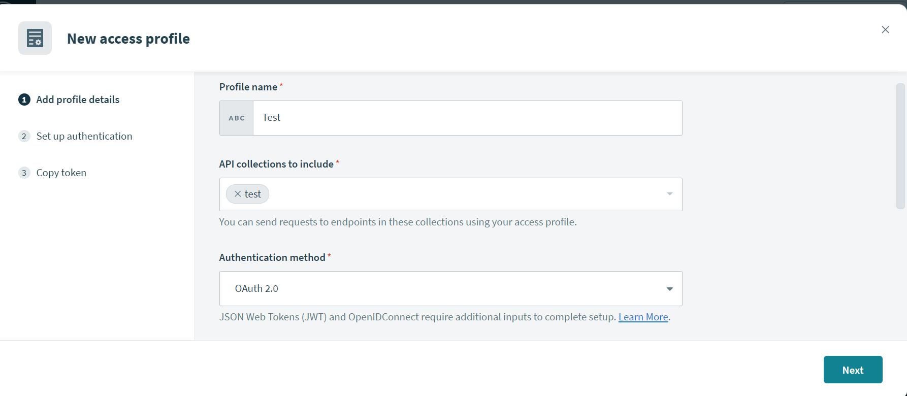 Create an access profile for the collection, Click on New access profile. It will ask for the profile name and API Collection that needs access from this profile. Select the Authentication method as OAuth 2.0 Policy, as shown in the below image.