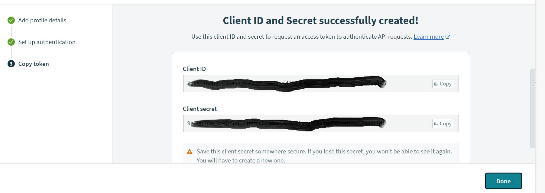 Click on the following and create access profile, client ID and client secret will be generated for the profile. The generated id and Secret need to be used for requesting URLs. Copy the generated ID and Secret.
