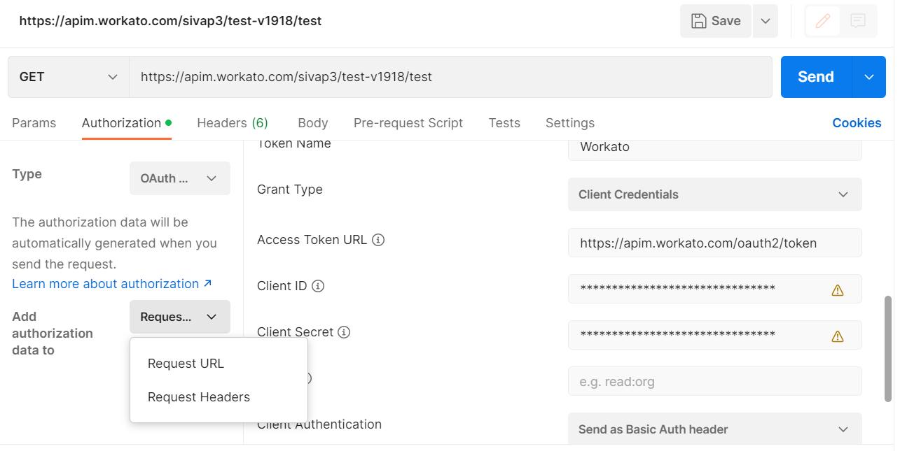 Select the Add authorization data to Request Headers.