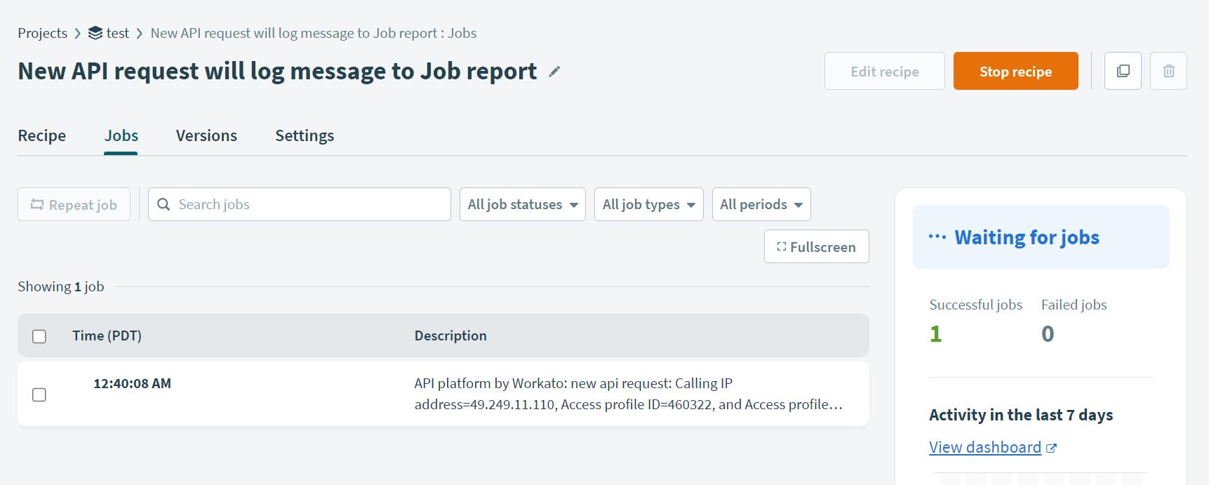 Observe the successful jobs in the jobs section of that recipe.