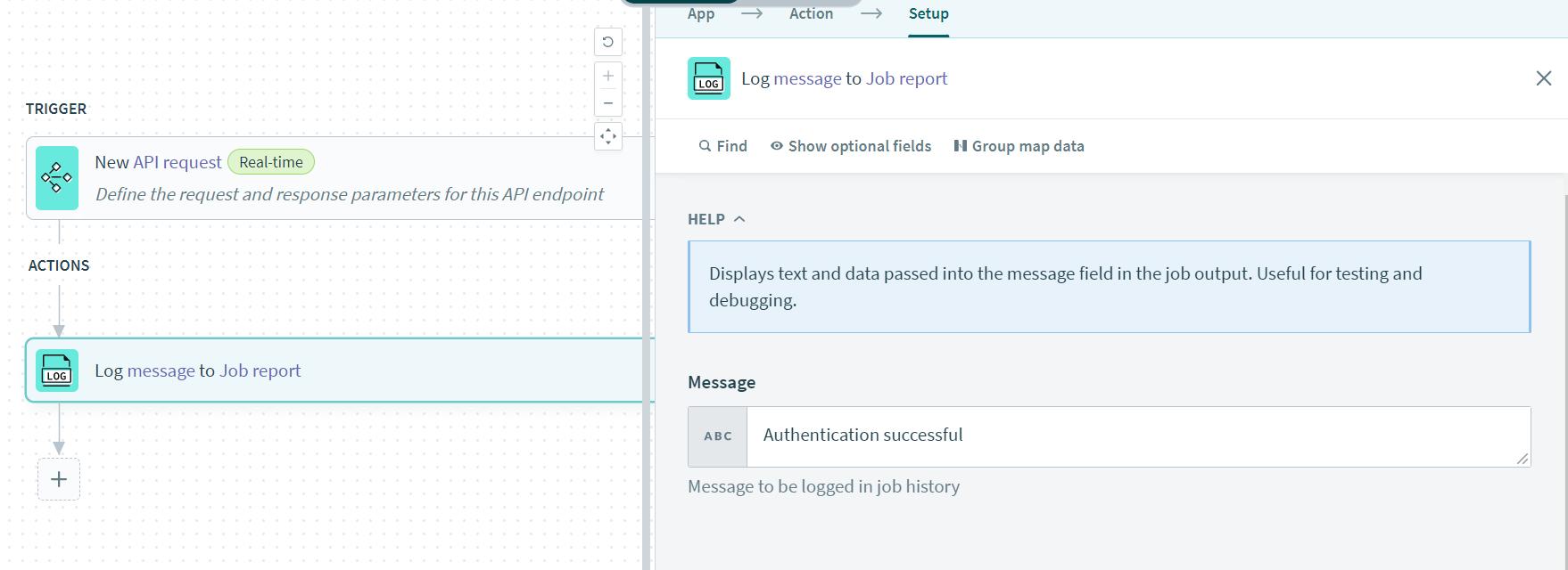 Take a sample logger by selecting “Logger by Workato”, place the message as ‘Authentication successful’ and save the recipe and click on exit.