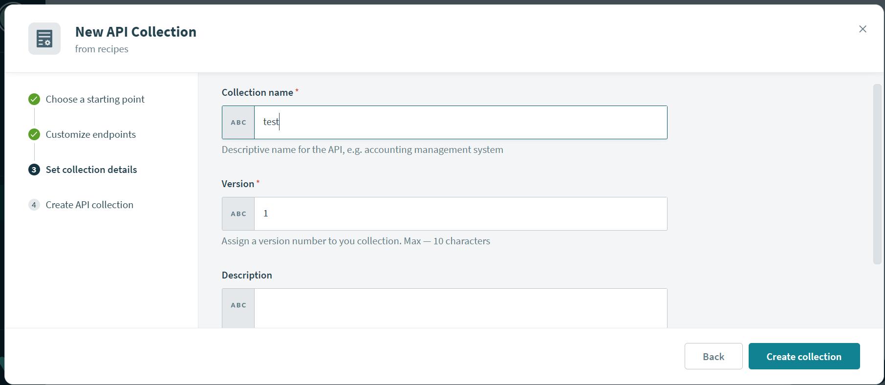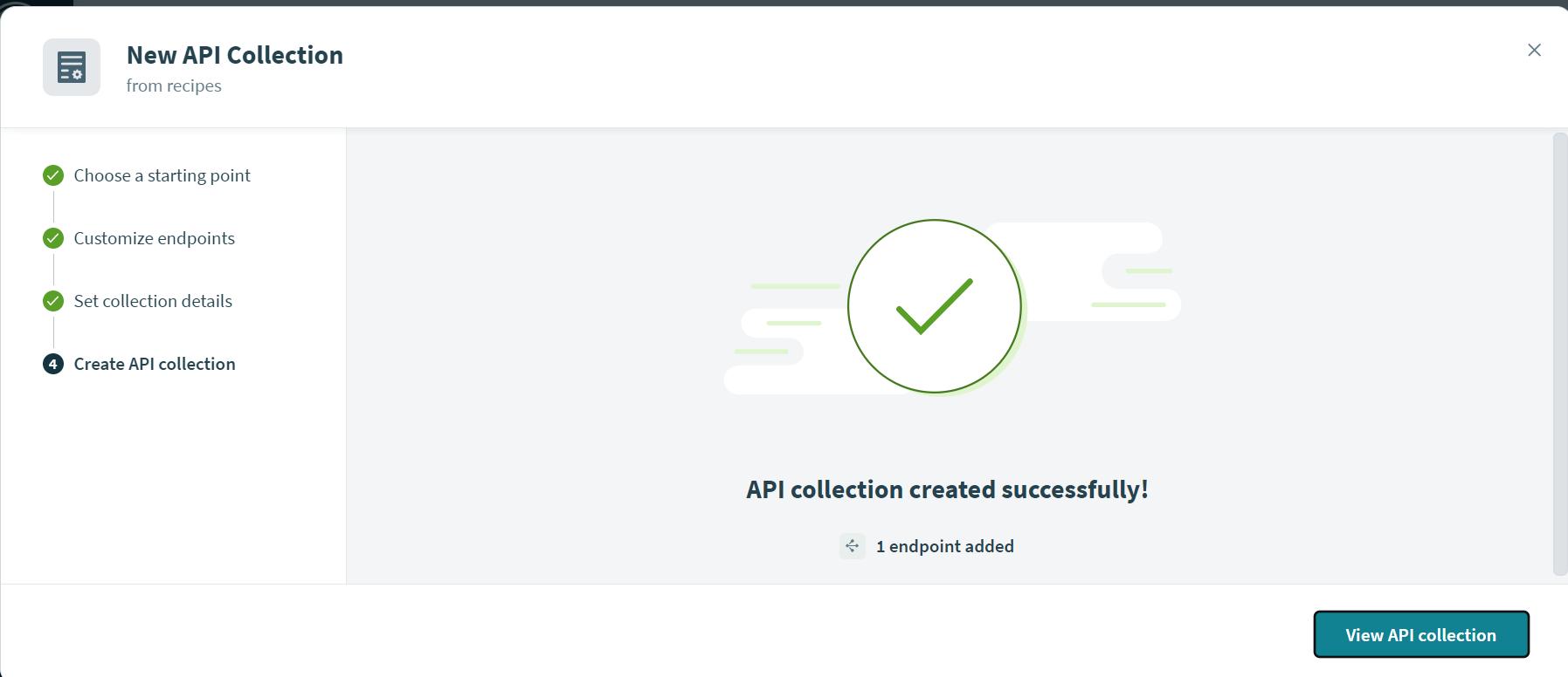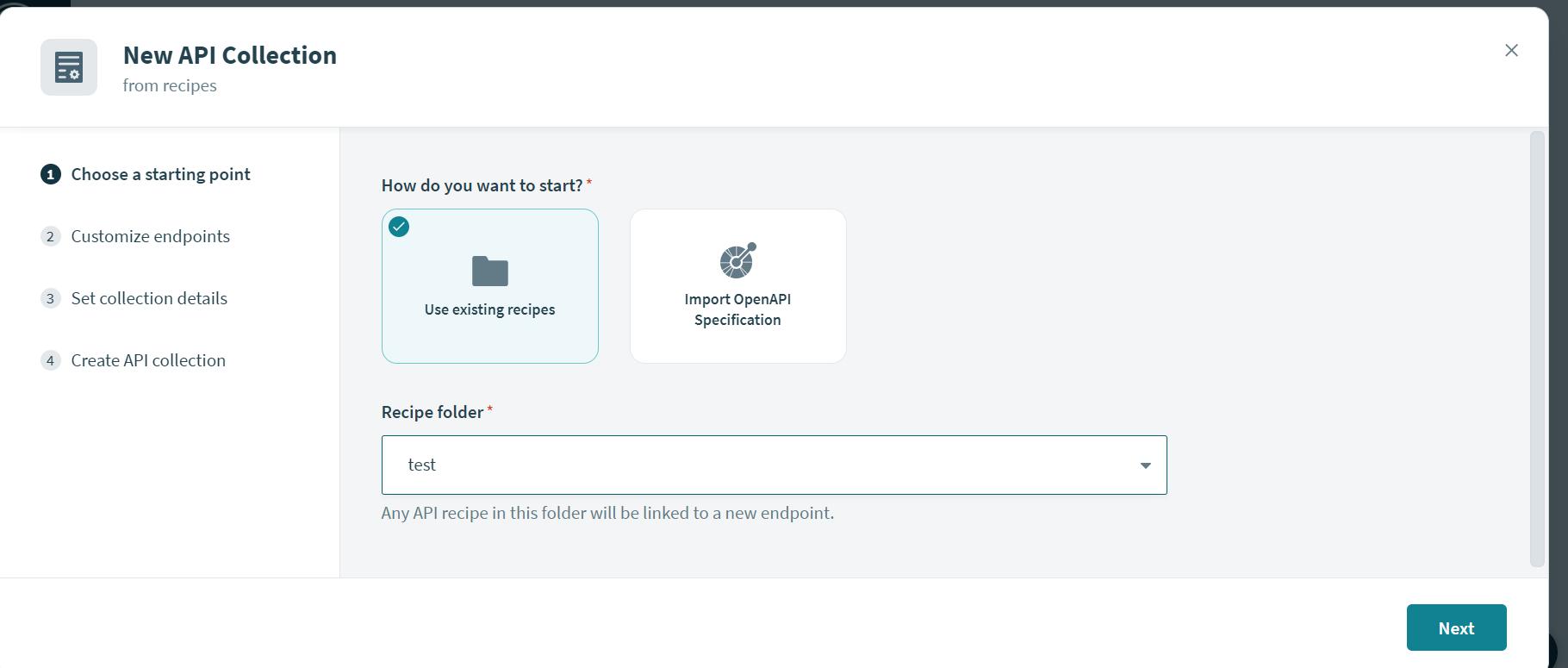 Now select the API collection. Click on create new API Collection. It will pop up a new window, and then select the option USE EXISTING RECIPE and select the folder where the recipe had been stored.
