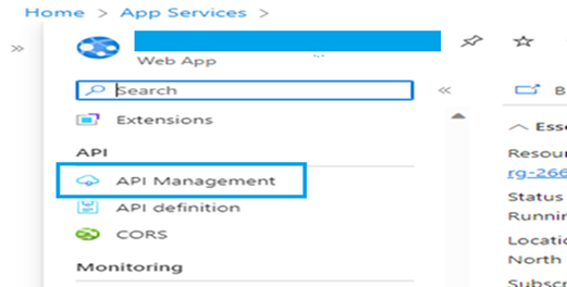 log in to Azure Portal: https://portal.azure.com/, go to Azure app service where your application is deployed and in the left panel, in the API section à API Management.