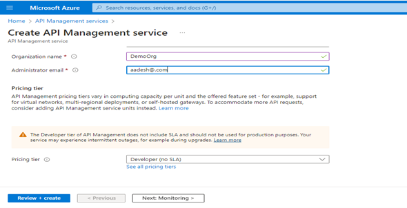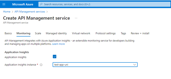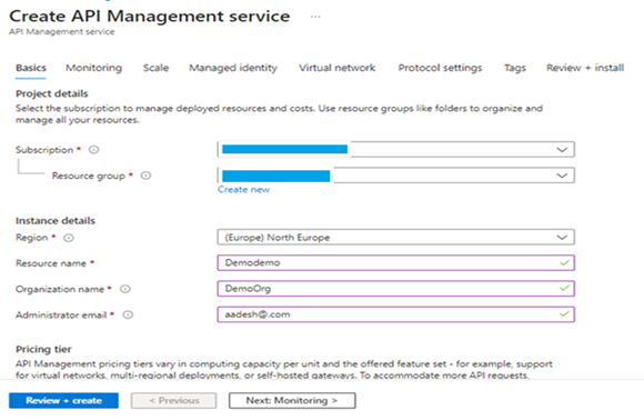 - Once you add the basic details, click on Review and Create. Select the APIM once it is created.