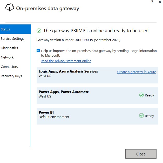 The status shown above indicates that our recently registered or created gateway is operational and is available for connecting on-premises data sources.