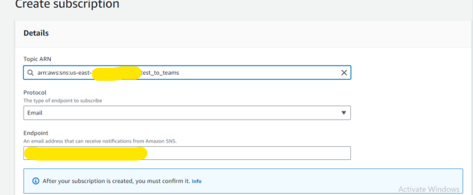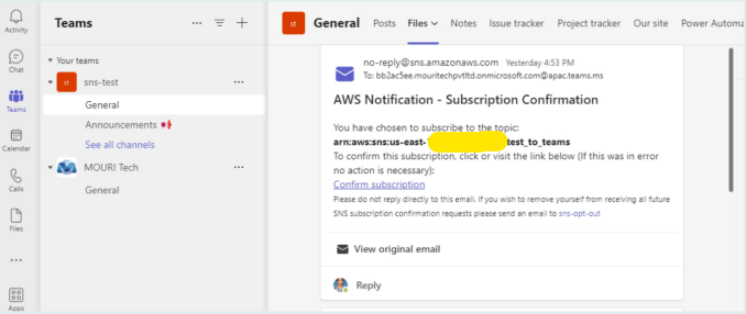 Now we will receive a notification in Teams to confirm the subscription. We need to confirm the start of receiving notifications from AWS SNS.