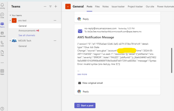 With this, all settings are done. If in any case our glue job stalls or fails, we will get the Teams notification as shown below: