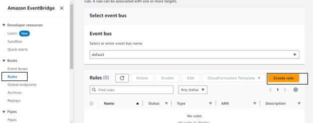 Open the AWS Management Console and go to the AMAZON EventBridge and click on the “Rules” tab in the navigation pane.