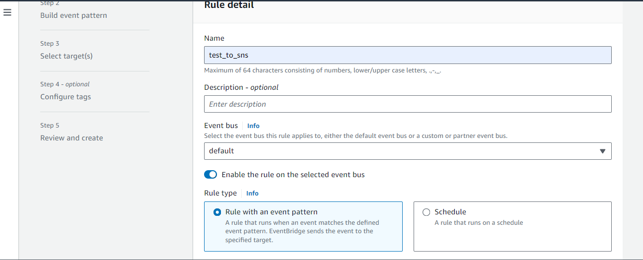 Select ‘Create Rule’ and enter the “Rule name”, then select Rule type as “Rule with an event pattern” and click on next.