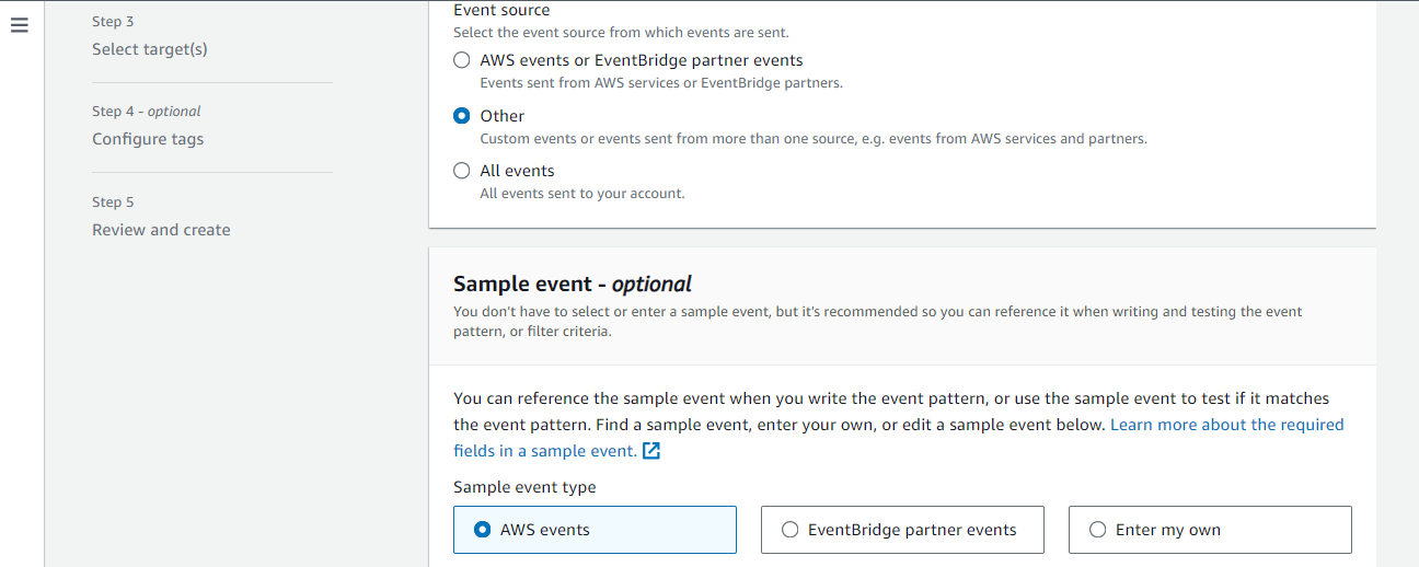 Next enter the Build event pattern details select Event source as” other” and Sample Event as ‘AWS Events’.