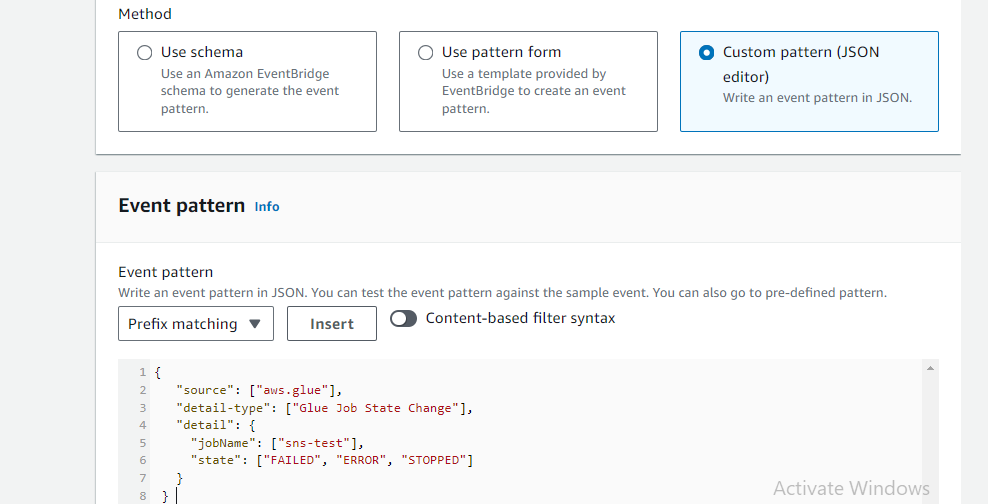 Select Creation method as “Custom pattern” and pass the Json showed below. And replace the <GLUE-JOB-NAME> with actual name of the glue job.