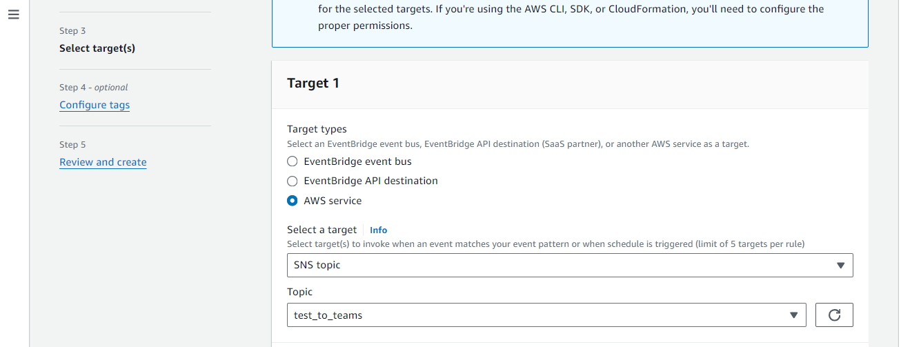 In Step 3, Select target(s), select target type as “AWS Service” & select “SNS Topic”. We will get all the SNS topics in drop down from the list. We need to select topic which we have created in Step 2.