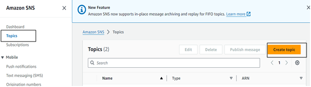 Open AWS Management Console and go to Simple Notification Service (SNS). Click on Topics then create topic.