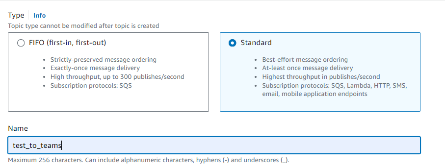 While creating a topic select type as Standard and create topic by providing appropriate name.