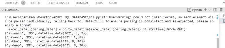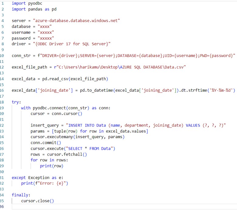 - In this step, you will find the Python code required to establish a connection between the data in an Excel file and an Azure SQL database.