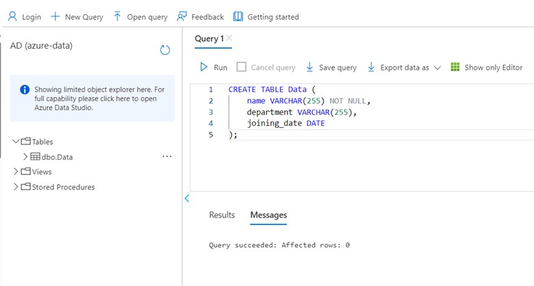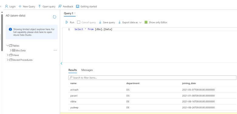 - Finally, verify the output in the Azure SQL database. Querying the table will confirm that the Excel data is successfully connected and operational in Azure SQL.