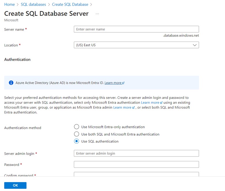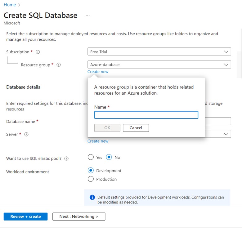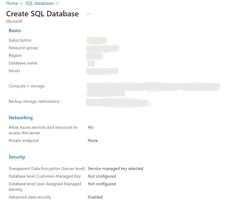 - Review all the provided details to ensure accuracy before clicking “Create” to initiate the SQL database creation.