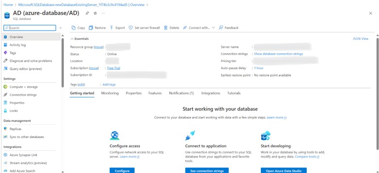 - After successful validation, click “Create” to begin the deployment process. This will result in the creation of an SQL database.