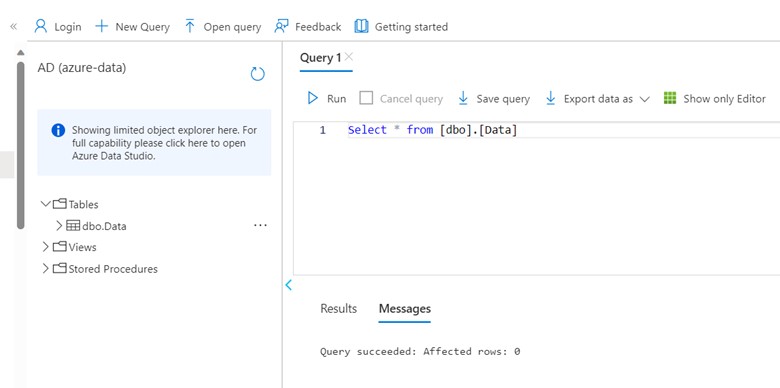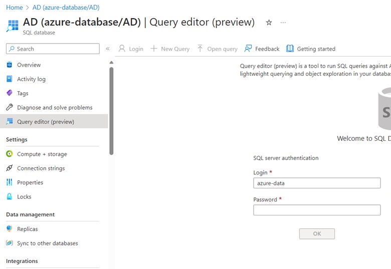 - Navigate to the query editor and log in using credentials for your SQL server.