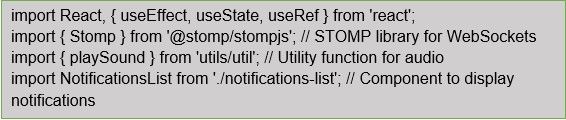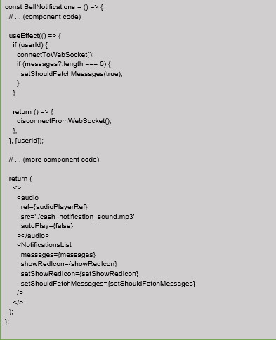 Next, create a React component, which we will call “BellNotifications,” to manage WebSocket connections and real-time notifications: