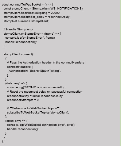Now, let’s set up the WebSocket connection in the “connectToWebSocket” function. This function handles the initial connection, authorization, and subscribing to WebSocket topics: