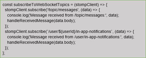 After a successful connection, it is crucial to subscribe to specific topics to receive real-time messages. Implement the “subscribeToWebSocketTopics” function: