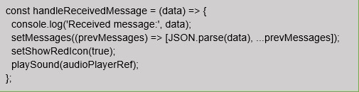 Handle incoming messages in the “handleReceivedMessage” function. This function processes the received data, updates the state, and plays a notification sound:
