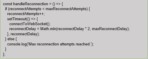 If the WebSocket connection encounters an error or gets disconnected, the “handleReconnection” function attempts to reconnect with an exponentially increasing delay, with a maximum limit.