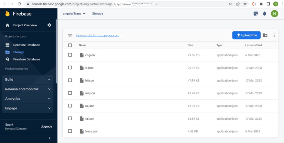 - Upload all the language JSON files in the Storage by clicking the Upload File button