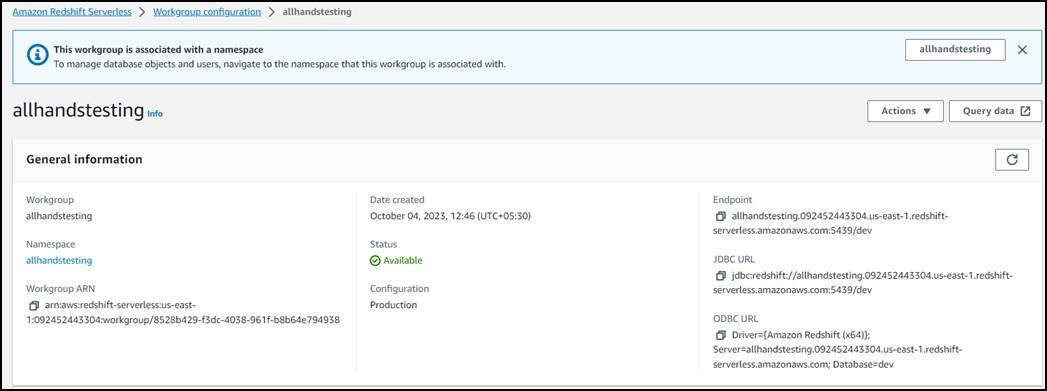 When you select your namespace, you can see details like EndPoint, JDBC, ODBC, ARN URLs, and security groups.