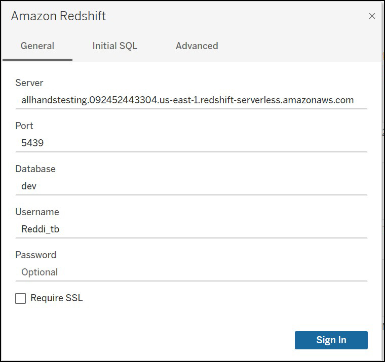 Server: allhandstesting.092452443304.us-east-1.redshift-serverless.amazonaws.com