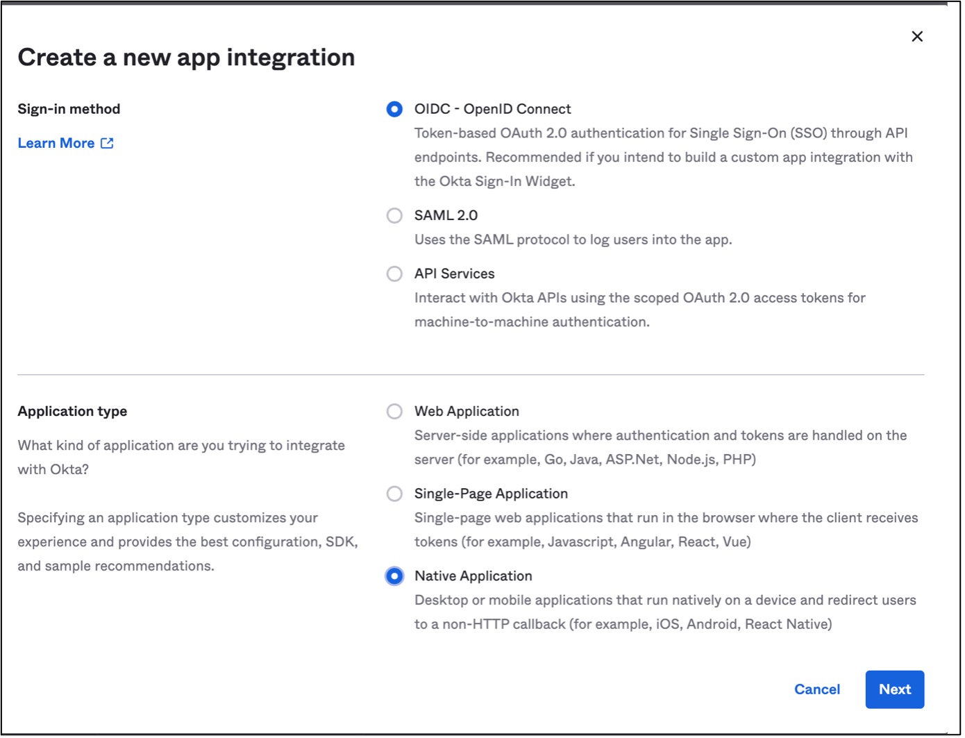 Browser Sign-In -This redirects the user to the OKTA browser login page of your organization which is for authentication. The user is redirected back to the React Native application after authenticating.