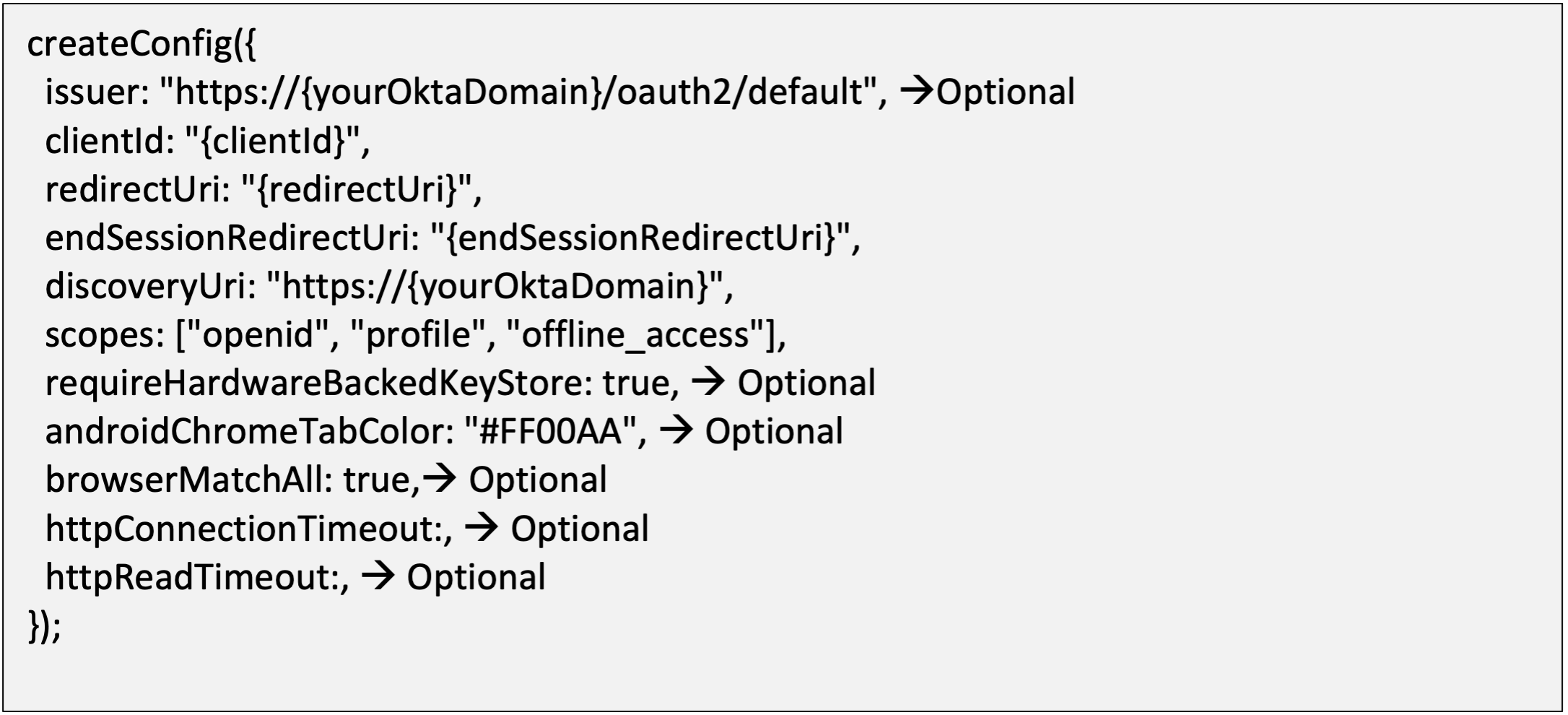 The most important part is where we define our config object to be used for OKTA authentication. You will need your issuer, ClientID, redirect URL, and so on, and they all can be retrieved from your OKTA application dashboard. Create a config.js file at the root of your project.