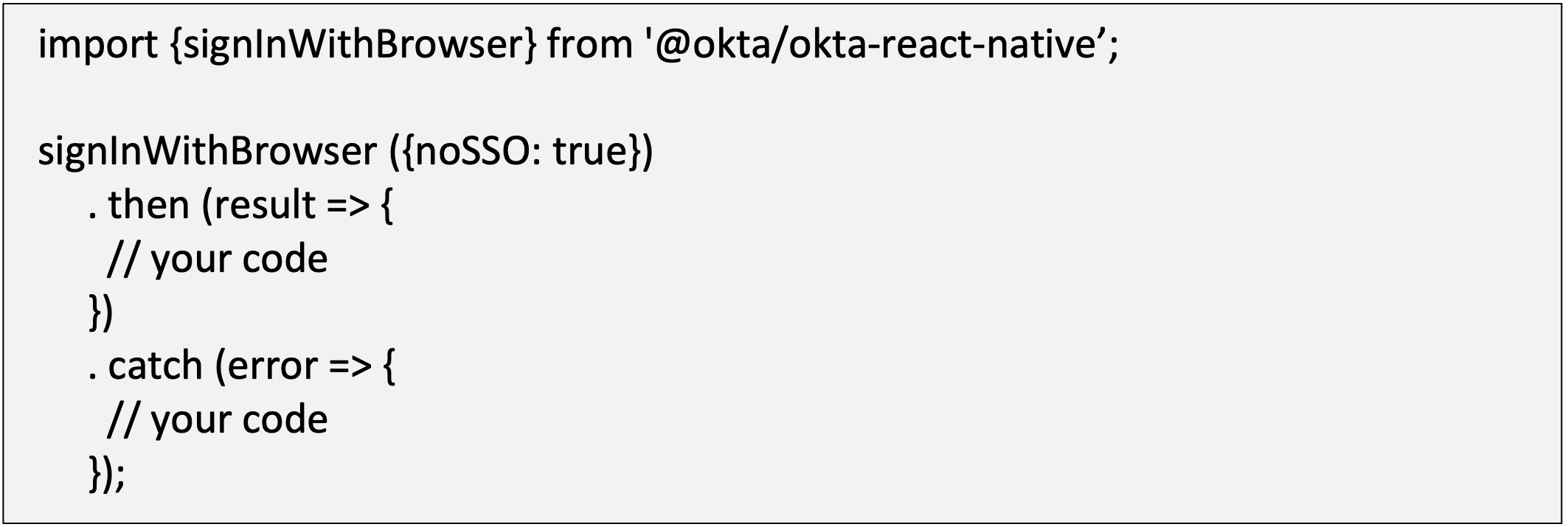 In the above code, if you want to get rid of the system sign-in and sign-out alert on iOS, pass the noSSO parameter when calling the signInWithBrowser method.