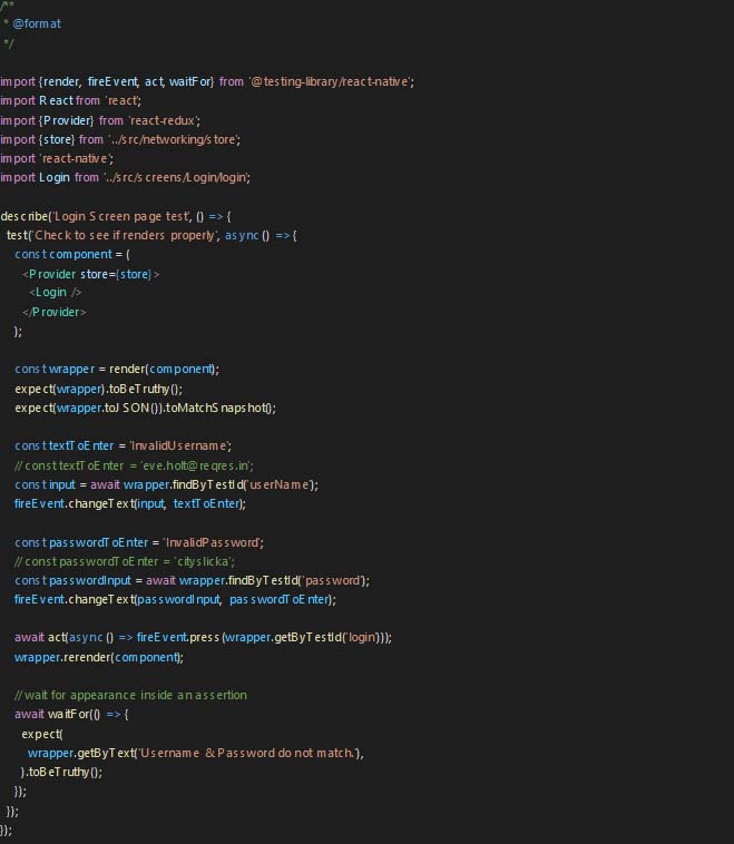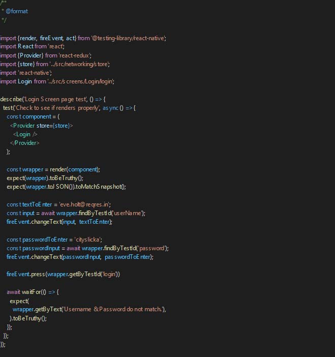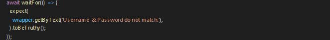 This method will press the login button. Now we need to check if the error message’s visibility is toggling or not. For this, we will use the waitFor method from the react-native-testing-library.