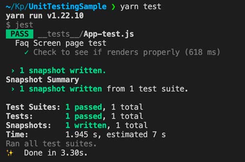 There is one more aspect of the unit testing for real-life scenarios. It is called ‘Mocking.’ When you have third-party libraries installed like Async Storage, Google Analytics, etc., you might have to mock those libraries for passing your tests.
