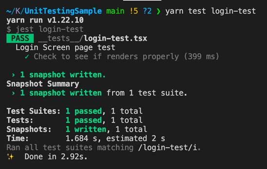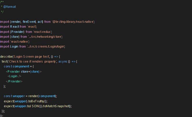 First, let’s create a separate test file for creating test cases for the login page as login-test.tsx and paste the following test case in it to check if we write snapshot test for the existing login screen will pass or not.