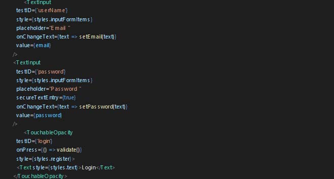 To test the above, we need to pass some values to the TextInput, and to do so, we need to add testID to all the test input and login buttons.