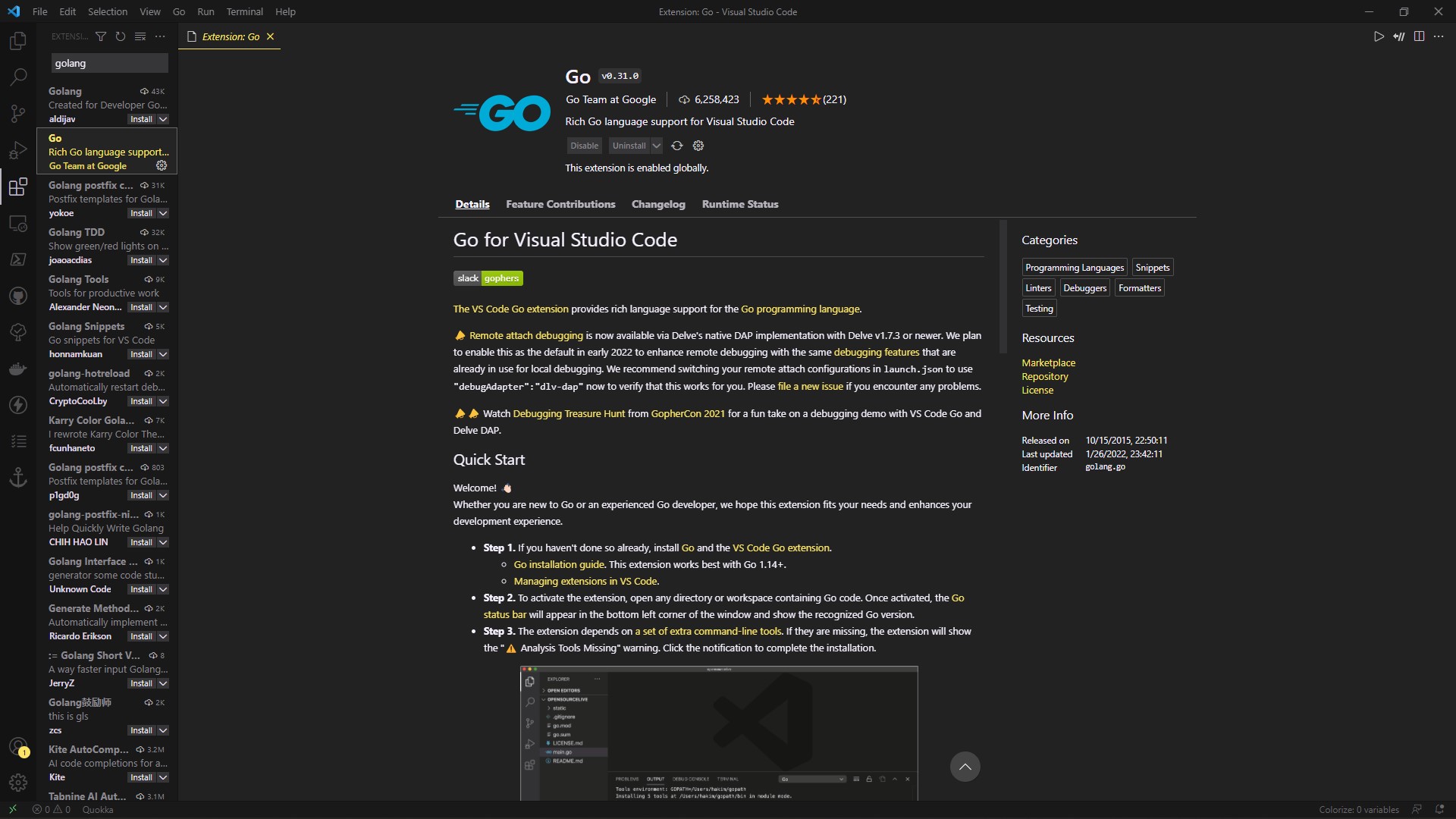 Moving on to step two: Install visual studio code. In order to write a code, you could use any other IDE (INTEGRATED DEVELOPMENT ENVIRONMENT) or even a Text editor. If an IDE is used, do not forget to download its plugin or extension for Golang from its marketplace. In this case, GO has been downloaded from GO From GOOGLE Extension.