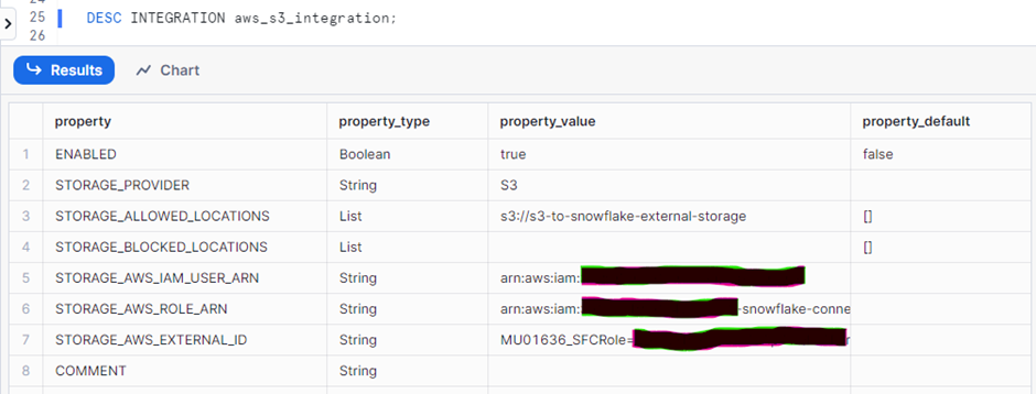 Here’s the command to retrieve STORAGE_AWS_IAM_USER_ARN and STORAGE_AWS_EXTERNAL_ID. These IDs will be used to edit the IAM role Trust Relationship created in step 3.
