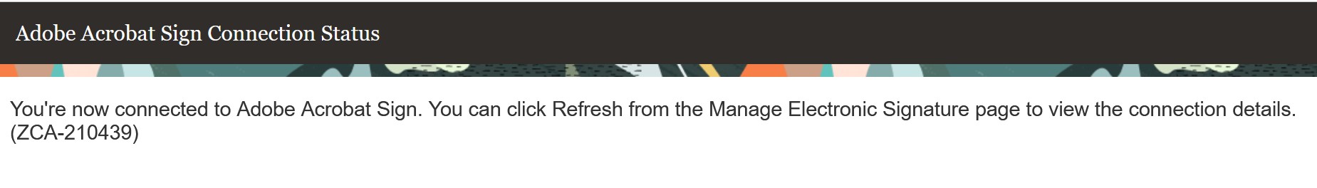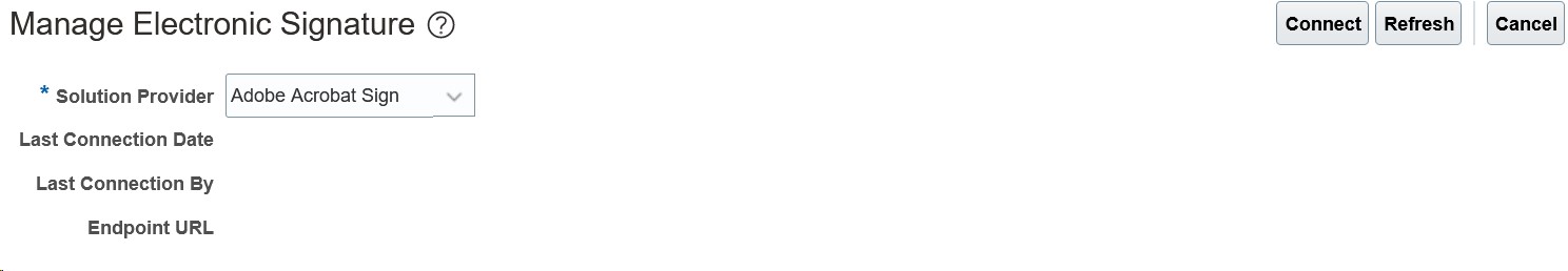Go back to the ‘Manage Electronic Signature’ UI and click on ‘Refresh’ button. If the connection was successful, ‘Last Connected On’ and ‘End Point URL’ will be displayed. In case of any failure during the setup process, click on the ‘Connect’ button to retry the setup.