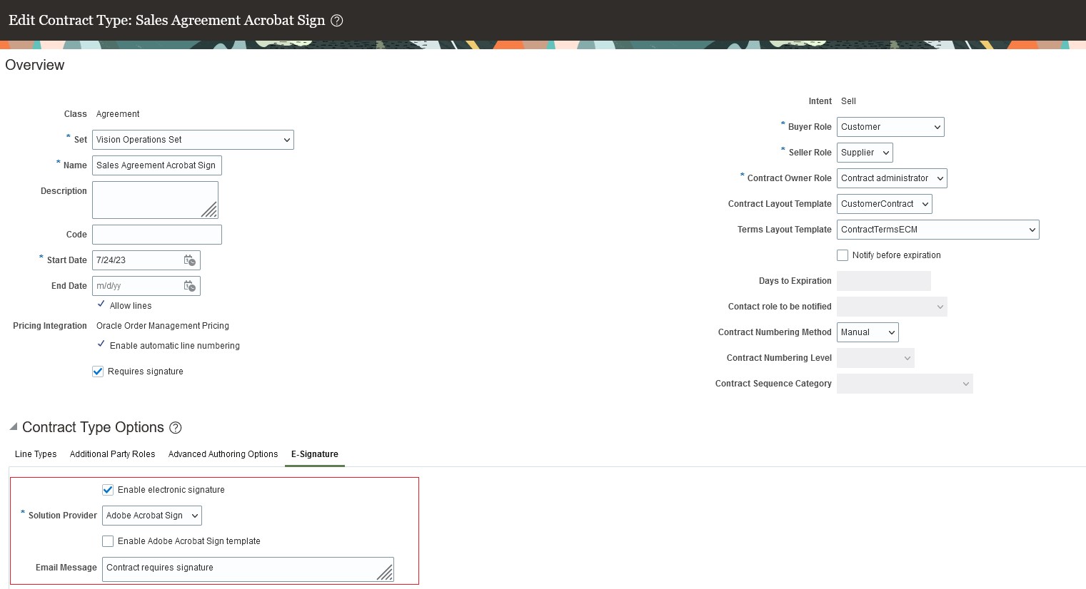 When we create a contract from a contract type enabled for Acrobat Sign, we can designate one or more party contacts as signers on the ‘Parties’ page and provide valid email for them. When the contract is in ‘Pending Signature’ status, a user with edit privileges on the contract can send the contract for signature to the designated signers by email. Such a user can be an administrative user or a user with full access on the contract. The contract author who plans to send the contract for signature must have a valid email address and must be set up as a user in the Adobe Acrobat Sign account that’s specified in the electronic signature setup. The Fusion Application’s email ID of the user must match the Adobe Acrobat Sign account email ID. When we click on ‘Sign Contract,’ in the integrated UI, Acrobat Sign agreement is created. We can add more tags in the agreement, add additional signers, add a private message to signers, etc.