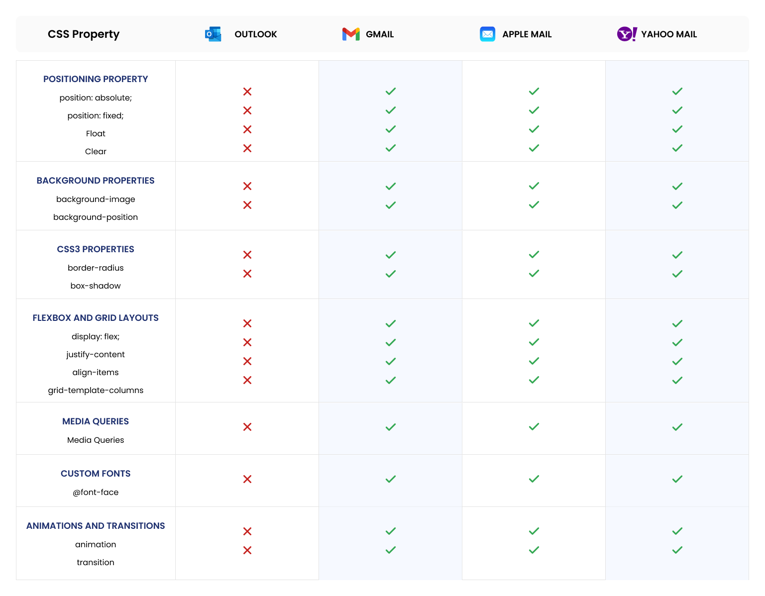 Keywords: Outlook Mail CSS, Email design, CSS properties blocked by Outlook, Email client compatibility, VML for emails, MSO conditionals, Email layout best practices, Responsive email design, Inline CSS for emails, Email rendering issues, Background images in emails, Custom fonts in emails, Media queries in emails, Flexbox and Grid in emails.