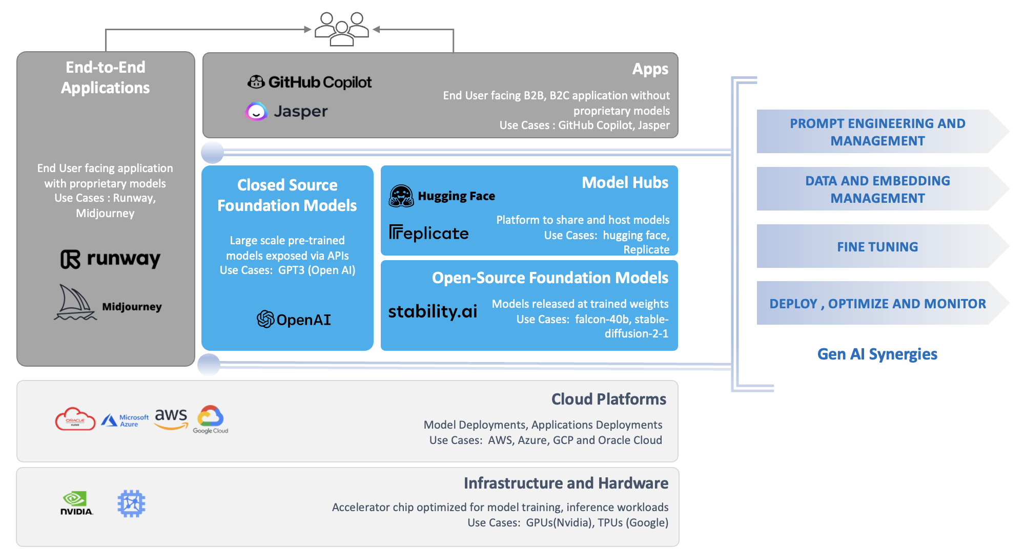 Generative AI is ushering in a new era of the digital ecosystem, which encompasses hardware providers to application builders. It is hoped that this will help realize its potential for business. The ecosystem has started budding already as people started have stated using Chat GPT so regularly! Industries are exploring generative AI tools and digging deeper, for strategies accelerating their digital transformations. The fact that Chat GPT reached 100 million users within two months of its launch, is a phenomenon everyone wants to replicate, better.